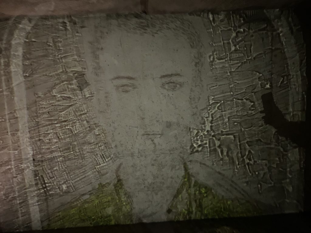 FACE-TO-FACE SERIES – Self-portrait of a renaissance, engraving and painting, old beveled mirror from 1922, 125 x 83 cm, 2023