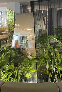PRESENCE I explore new mirrors to experiment with other formats. The eternal fountain, painting, new mirror, 150 x 80 x 40 cm, 2024The orange juice, engraving and painting, new mirror, 98 x 100 cm, 2024Karl, engraving and painting, new mirror, 100 x 100 cm, 2023Green wall #1, engraving and painting, new mirror, 45 x 77 cm, 2024
